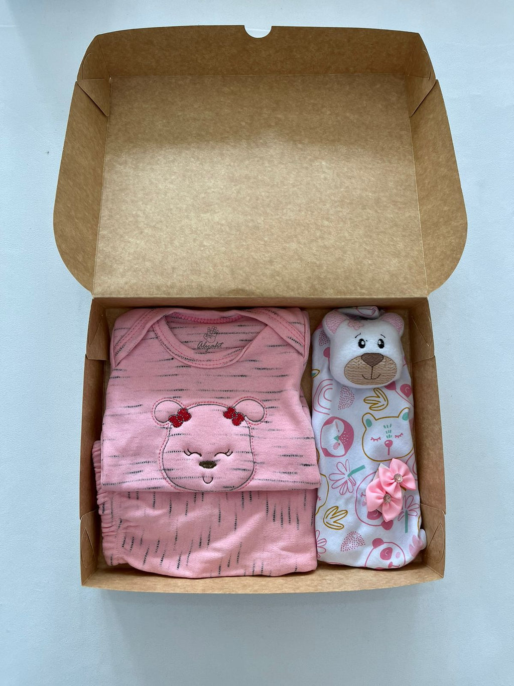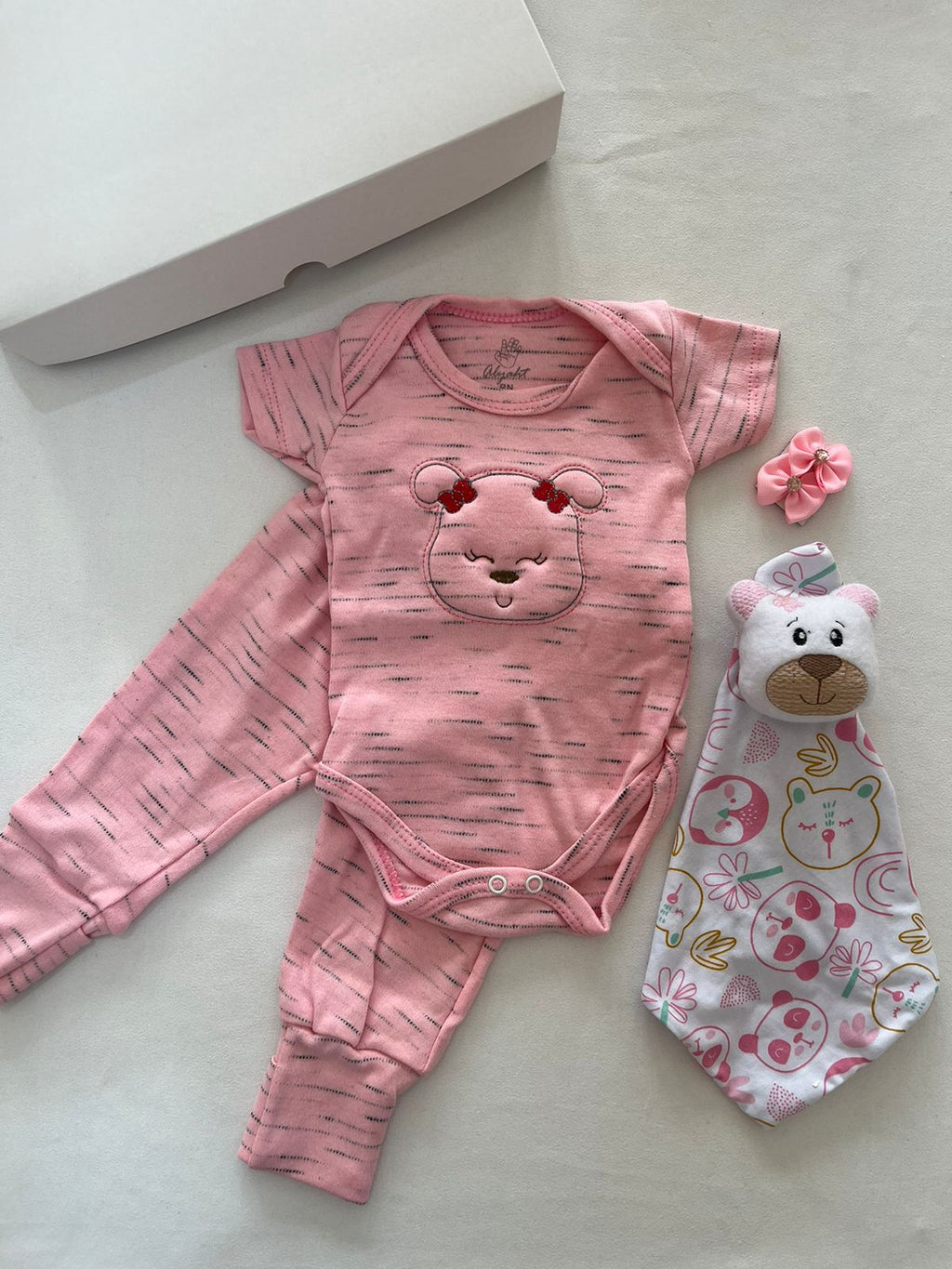 Kit Presente Fofura, perfeito para presentear aquela bebê maravilhosa! Composto com 1 body, 1 mijão, 1 par de laços e 1 naninha.